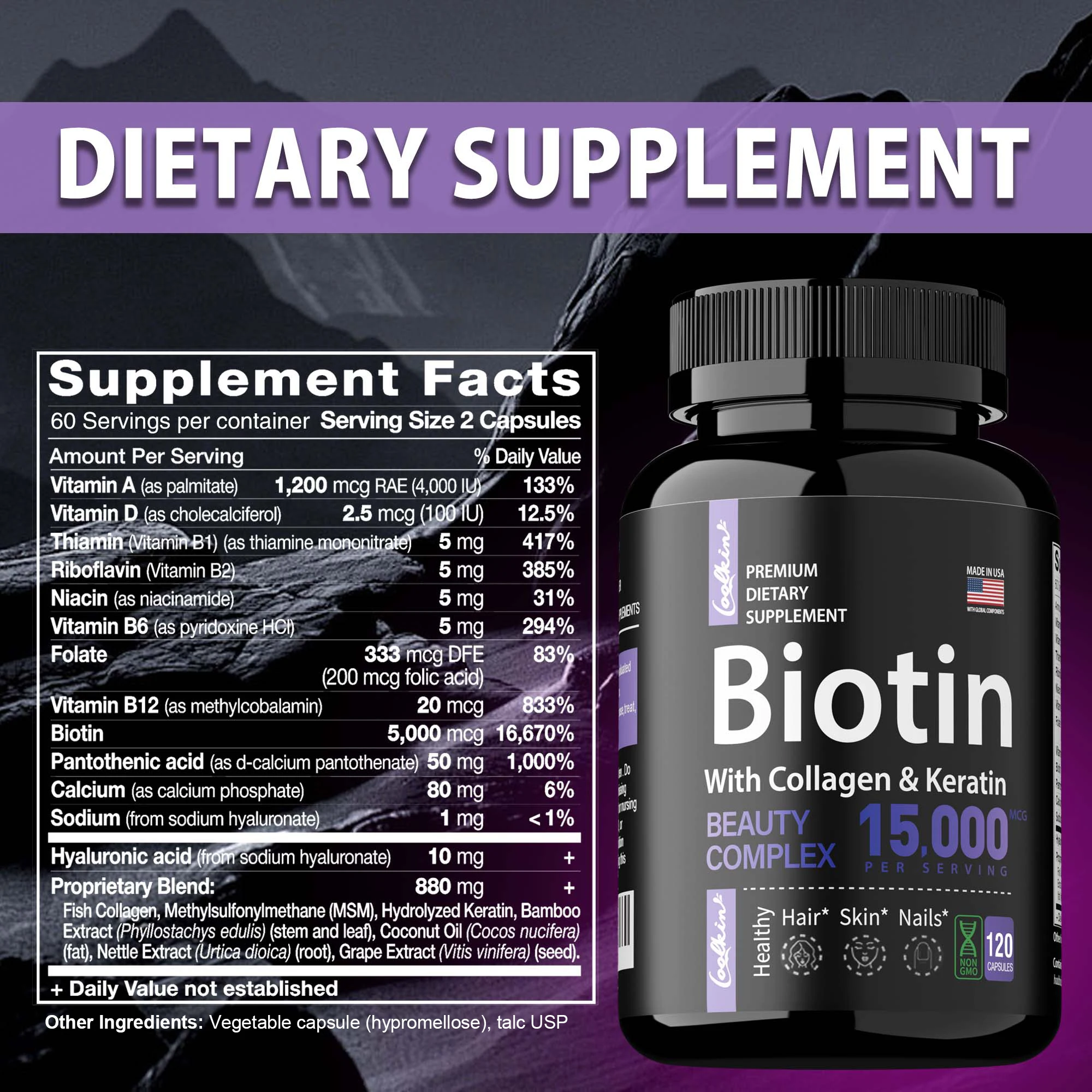 Biotin Supplements with Hyaluronic Acid and Collagen: Coolkin Biotin Supplements contain powerful biotin, collagen, keratin, and other essential nutrients to naturally support your health and beauty. Features our highly bioavailable formula to promote fast, correct absorption. Take good care of your skin.